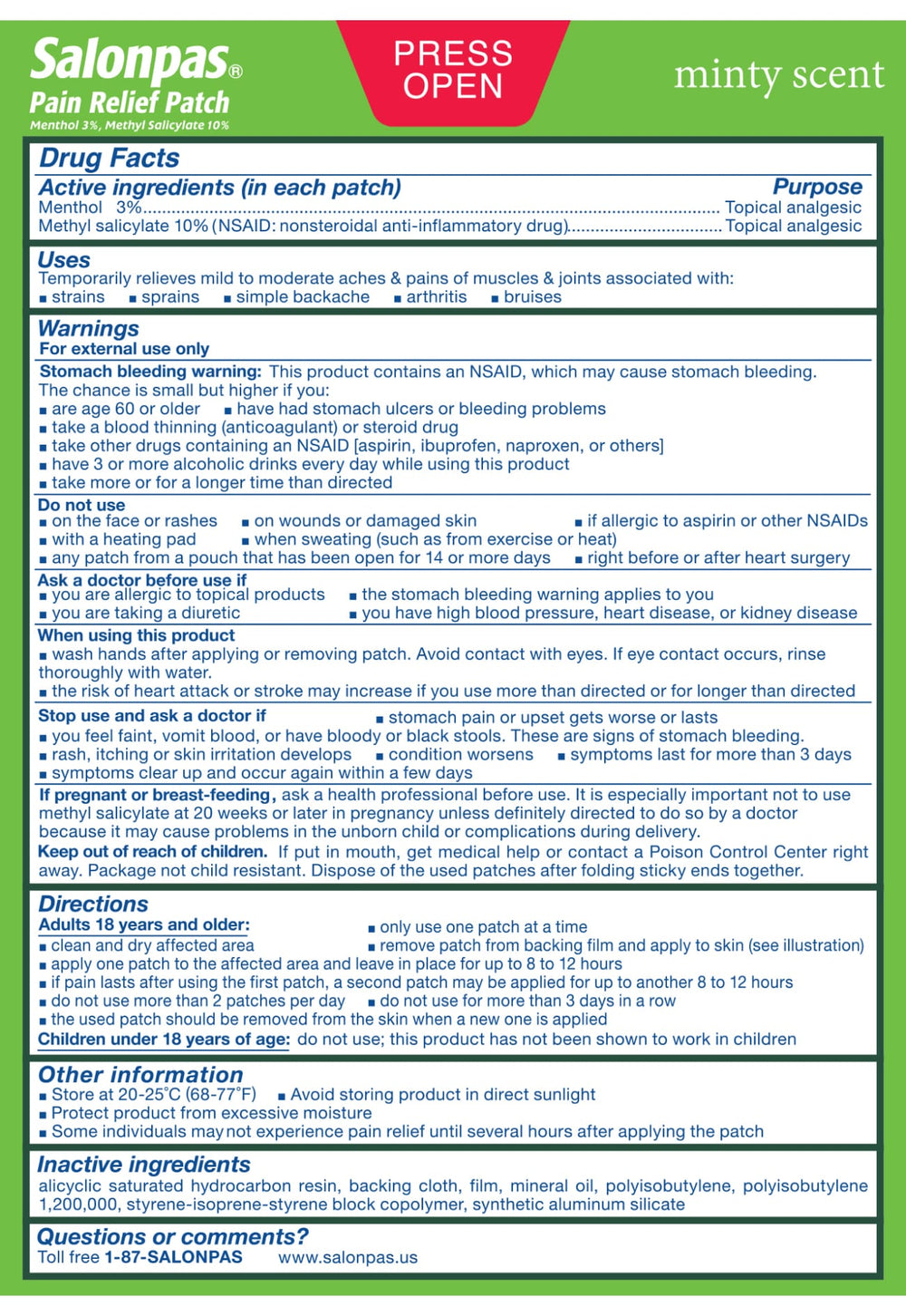 Salonpas Ultra Thin is a pain relief adhesive patch that contains medicated ingredients that penetrate into the affected area to soothe muscle and joint pain. Salonpas Ultra Thin, combined with menthol properties, is stretchable, breathable and easy to peel. Flexible materials to fit the application area. Leave no sticky residues when removed. Skin-tone color.