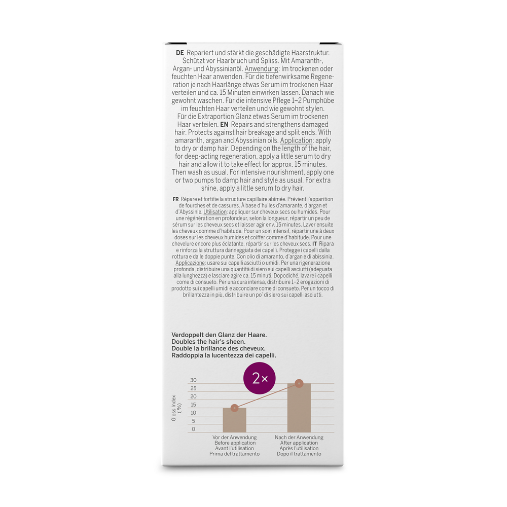 Serum that adds double the shine to damaged and brittle hair. Strengthens the hair structure thanks to a unique combination of oils, while also intensively nourishing the hair and repairing it from root to tip. Protects against hair breakage and split ends, and adds a wonderfully deep shine to the hair. With amaranth, argan and abyssinian oils, as well as cuckoo flower and babassu oils.