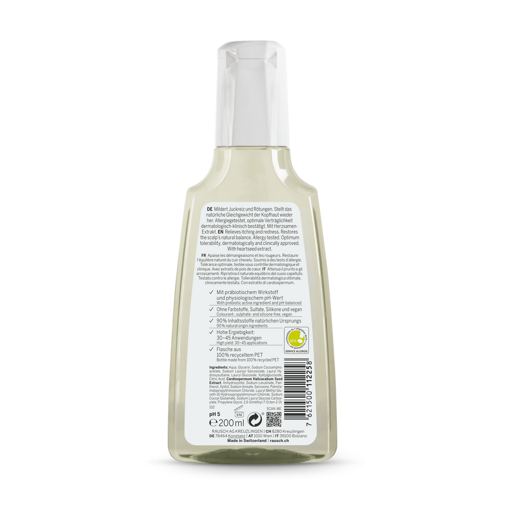 Shampoo for a highly sensitive and irritated scalp. Cleanses very gently and alleviates itchiness and redness. Its beneficial prebiotic active ingredient and physiological pH restore the scalp’s balance. It is allergy-tested, free from any colourants and sulphates, and its optimum tolerability is dermatologically and clinically proven. With precious heartseed extract.