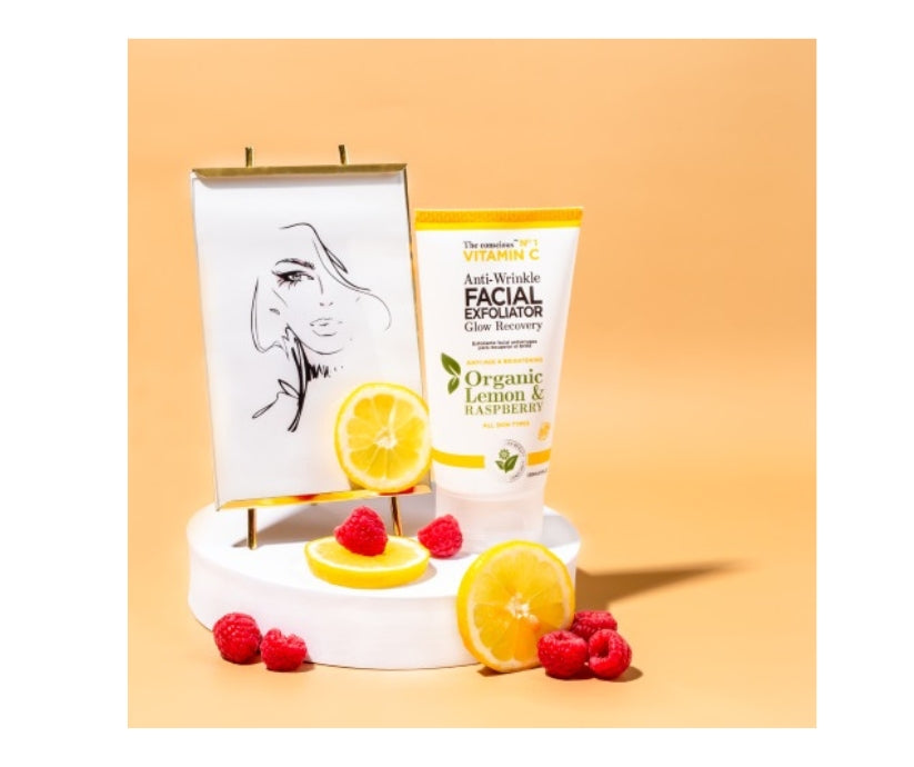 The conscious™ Anti-Wrinkle Facial Exfoliator for daily cleansing with anti-aging Vitamin C, Organic Lemon and Raspberry Leaves that smoothen your skin while also effectively removing oil and dirt, leaving skin fresh and clean with a natural glow.